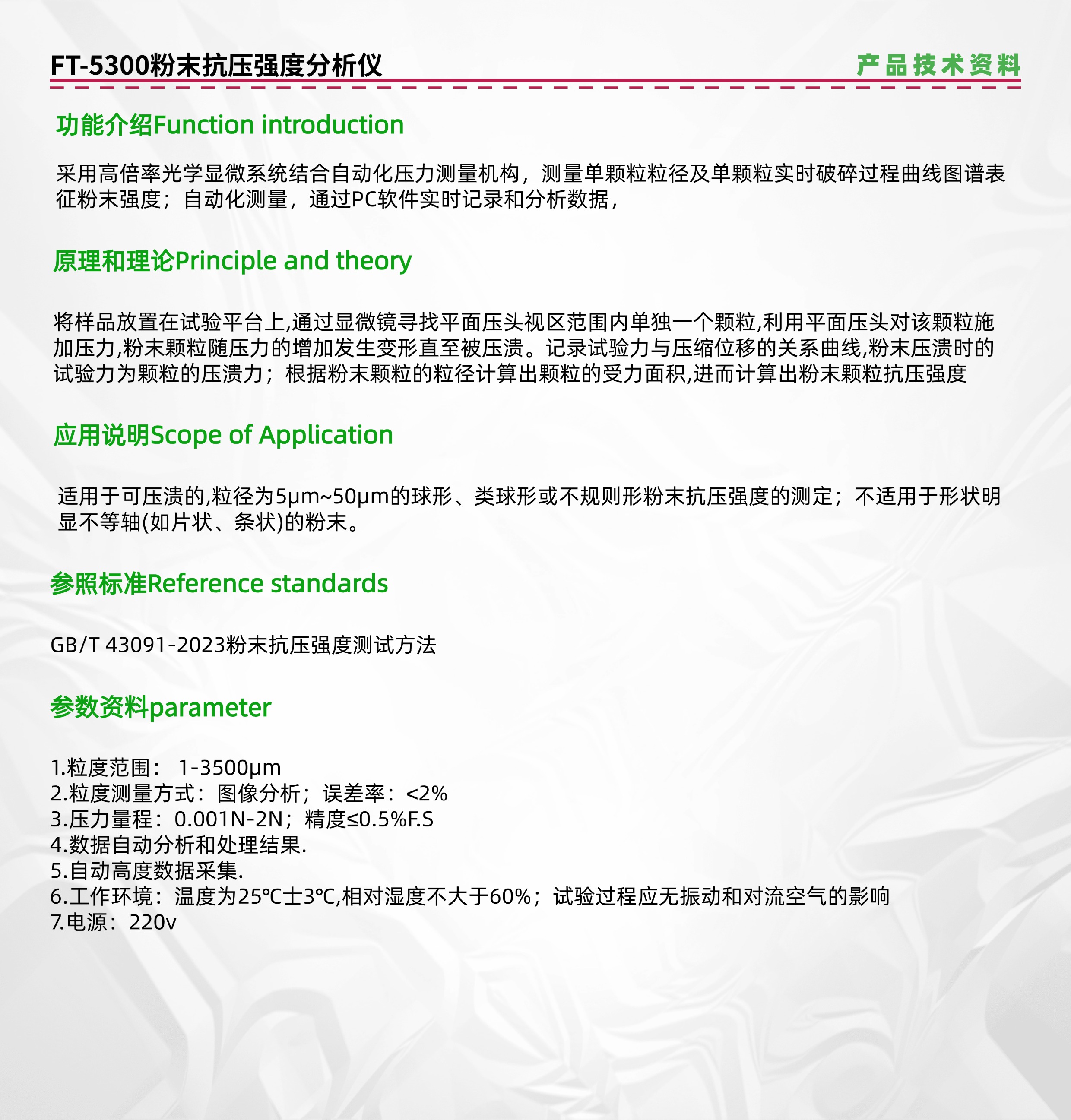 原理:將單個粉體顆粒置于兩個平行的平板或壓頭之間,通過逐漸增加壓力,直到顆粒被壓碎,記錄下顆粒破碎時所承受的zzui大壓力,以此來衡量顆粒的強度。