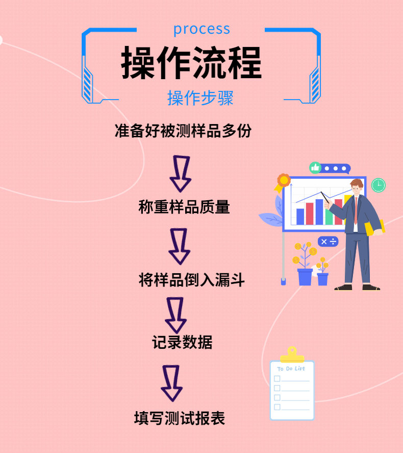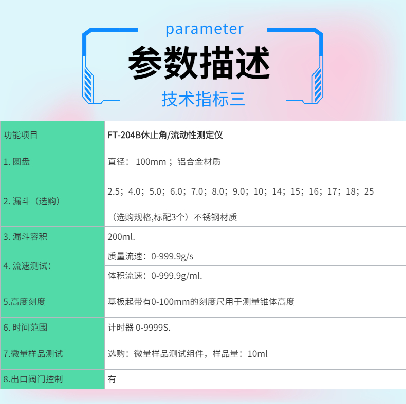 測試粉末和顆粒通過漏斗的時間和形成的角度,測試前進(jìn)行預(yù)堆積,從而已知樣品量,將已知質(zhì)量粉末從漏斗流出而形成的堆積角,以及流出所需要的時間;可以獲得休止角和流速數(shù)據(jù)。