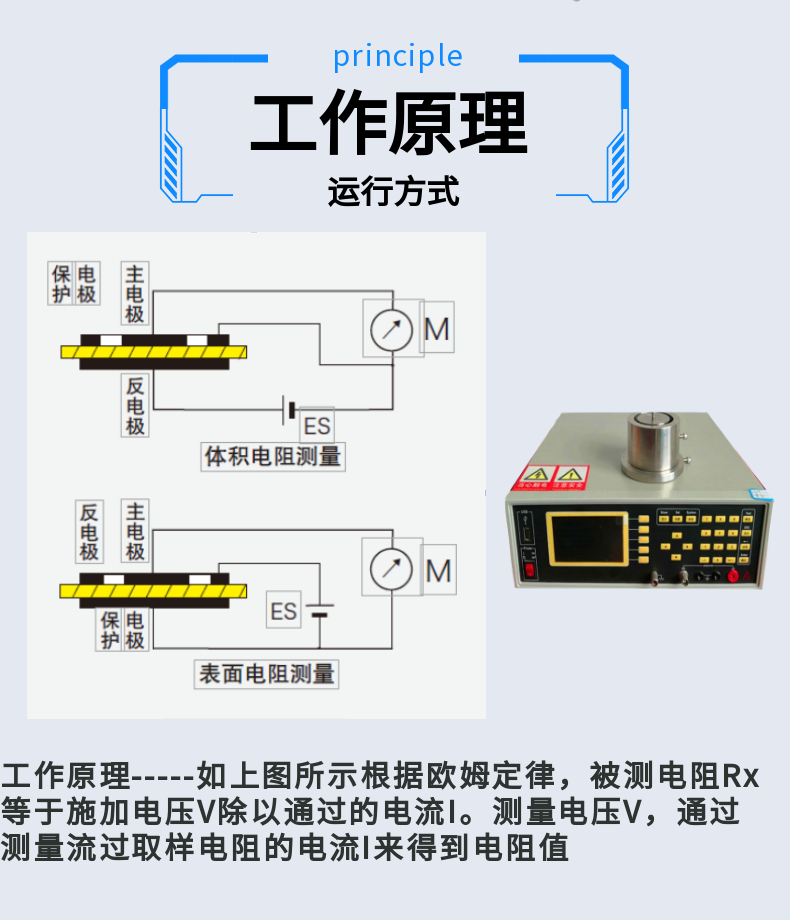 2、液晶顯示: 電阻、電阻率、電導率、電流、電壓、可輸入測試樣品數(shù)據(jù)(圓柱:直徑,高度;方體:長*寬*高)單位可以切換(mm、cm、m)