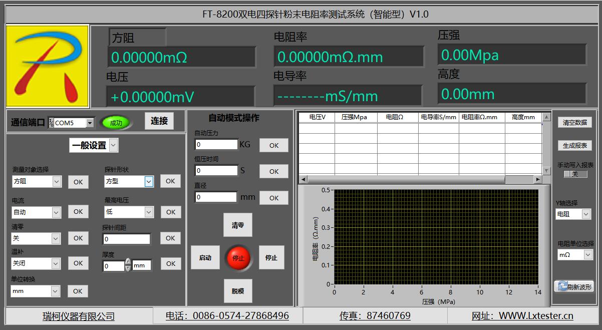 電阻、電阻率、方阻、溫度、單位切換、溫度系數、電流、電壓、探針形狀、探針間距、厚度 、電導率、圖譜顯示,壓力設定,壓強,報表導出,波形刷新,時間設定,啟動、停止、運行、壓實密度.